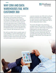 This whitepaper from our friends over at Profisee explains why achieving a complete view of the customer is so difficult and how customer relationship management (CRM) systems and data warehouses, especially in the insurance industry, do not manage customer-related data well. The core elements of this type of data fall into a discipline called Master Data Management (MDM).