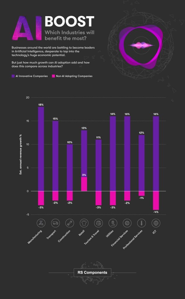 It’s widely agreed that the implementation of artificial intelligence is vital for future growth, but just how much impact can AI have across industries? RS Components has analyzed data from Mckinsey’s Global Institute to see how much revenue growth AI innovative companies can expect to see when compared to businesses who fail to invest in the technology. The full findings are found in a report, “AI Industry Boost – Which Industries will Benefit the Most?“