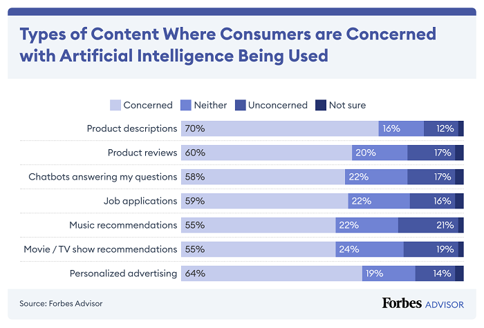 Artificial intelligence (AI) tools like ChatGPT are causing privacy concerns and overall confusion around the impact of AI. To better understand how consumers feel about these new artificial intelligence tools, Forbes Advisor surveyed Americans to find out their concerns, how they plan to use AI, whether they trust businesses using AI tools, and what types of personal data they are okay with using AI.