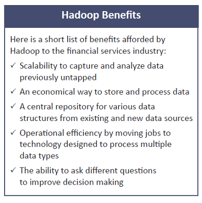Hadoop represents a good path for financial sector firms to adopt big data. With Hadoop, firms have access to a powerful platform providing both highly scalable and low cost data storage tightly integrated with scalable processing. Financial firms are now able to tackle increasingly complex problems by unlocking the power of their data. The capability to understand and act upon their data opens the door to a richer and more robust financial ecosystem.