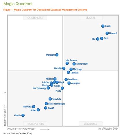 MongoDB has announced it is the only vendor, out of 25 vendors evaluated, to be positioned by Gartner Inc. in the “Challengers” quadrant of the 2014 Magic Quadrant for Operational Database Management Systems report. MongoDB has been recognized in the report for two consecutive years for its “ability to execute” and “completeness of vision.” A complimentary copy of the full report can be downloaded HERE.