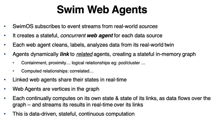 Swim adopts a simple application architecture in which each data source is represented by a stateful, concurrent live object called a Web Agent (see figure 5). Think of a Web Agent as similar to a digital twin, but it can process its own data, compute state changes and execute complex business logic, predicates and even predict in real-time, avoiding database round-trip delays. It can also react on behalf of its real-world data source, delivering responses in real-time. Web Agents dynamically link to each other based on real-world relationships between the sources they represent, like containment or proximity, or even a computed relationship such as correlation.  As Web Agents link to each other they form a dynamic graph of context-rich associations between data-sources at the most granular level possible.
