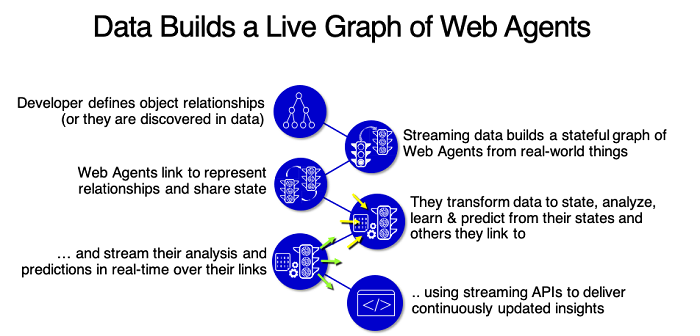 But there’s a second use for Web Agents that is vital in the delivery of continuous intelligence, namely their role as concurrent, application tier analytical objects that are the repository of both business logic and data processing: In our discussion of streaming analytics above we mentioned the need to deliver continuously coherent, real-time materialized views of the system that reflect degrees of ‘zoom’ for a top-down management view. Web Agents that hold materialized views of the state of the system may link to millions of other Web Agents, and continually compute over their states to derive KPIs or aggregate views that are of value to various top-down users. Using the power of links, relationships, analysis and learning in an application services tier of Web Agents allows developers to easily add additional tiers of services to an already active continuous intelligence deployment.