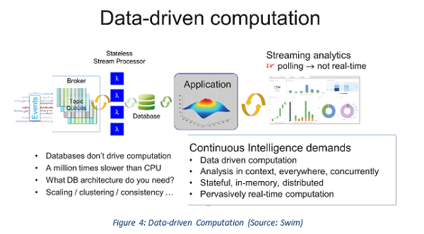 There’s another reason that smarter databases can’t help with continuous intelligence: They don’t drive computation of insights or “push” them to users. The inversion of the control loop is fundamental: In most applications that claim to be real-time, the query to a database drives computation, and the results are delivered to the user. But that’s not enough for today’s continuous intelligence use cases. Users want to deliver real-time responses to analysis, learning and prediction, as it occurs, concurrently for all entities in the system. They want the application to always have an answer. Databases don’t do that.