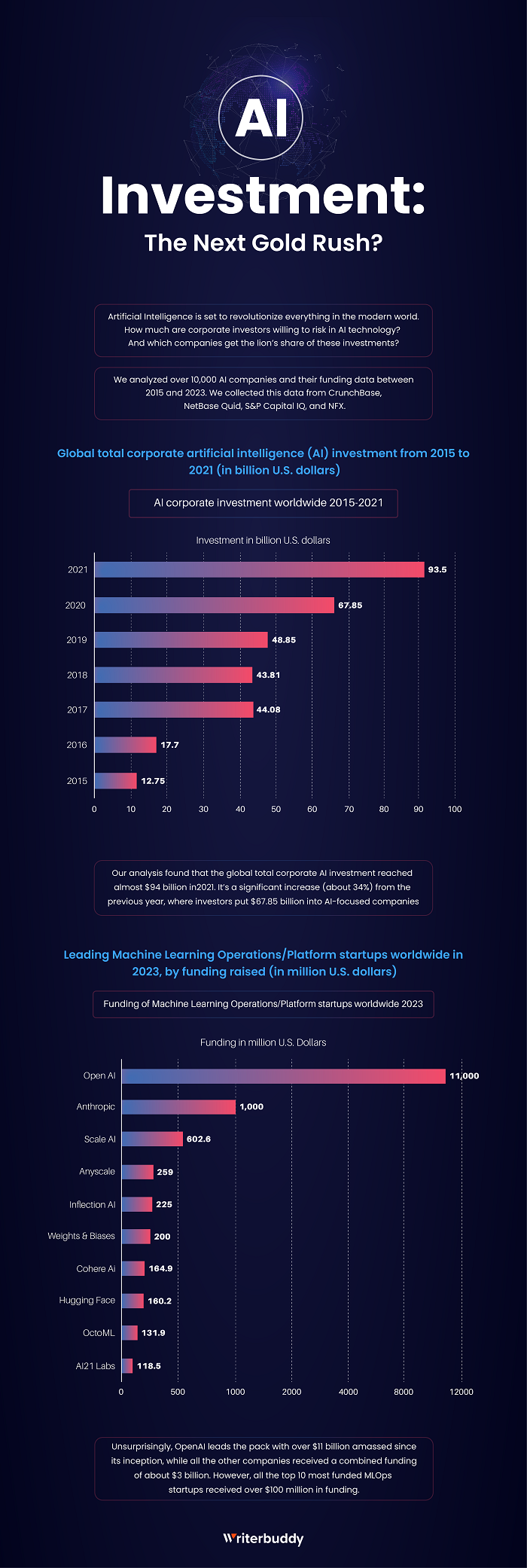 To answer these questions, our friends over at writerbuddy.ai analyzed over 10,000 AI companies and their funding data between 2015 and 2023. The data was collected from CrunchBase, NetBase Quid, S&P Capital IQ, and NFX. Corporate AI investment has risen consistently to the tune of billions. The investment soared from 12.75 billion dollars in 2015 to 93.5 billion dollars in 2021, marking a remarkable 633.33% increase over the six-year period.