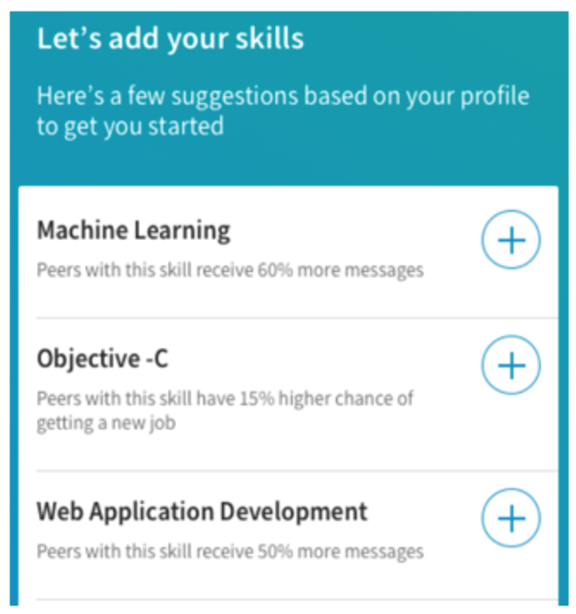 LinkedIn also leverages the Knowledge Graph to generate suggested additions to member profiles, e.g., “peers with this skill receive 30% more messages” or “peers with this skill have a 15% higher chance of getting a new job.”