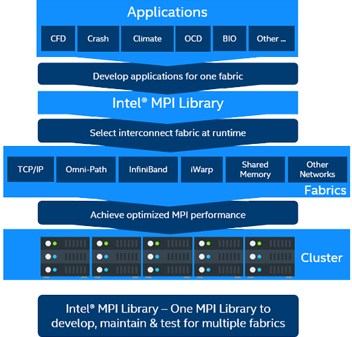 The Intel® MPI Library is a multi-fabric message-passing library that implements the open-source MPICH specification. The library is used to create, maintain, and test advanced, complex applications that perform well on HPC clusters based on Intel® processors. You can develop applications that can run on multiple cluster interconnects chosen by the user at run time, and quickly deliver maximum end-user performance without having to change the software or operating environment. The Intel® MPI library helps you achieve the best latency, bandwidth, and scalability through automatic tuning for the latest Intel® platforms. In addition, you can reduce the time to market by linking to one library and deploying on the latest optimized fabrics.