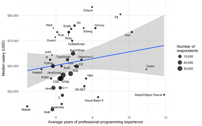 - F#, Ocaml, Clojure, and Groovy Command The Highest Salaries With median salaries above $70,000 USD, developers using these technologies earn more for their years of experience than those using other languages. Technology is not the only way for junior developers to bring in the bucks: Data Scientists with fewer than 6 years of experience can earn over $60,000 USD. The lowest earners are developers using PHP, Matlab and Assembly and those specialising in games / graphic development.