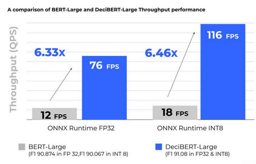 The model was submitted under the offline scenario in MLPerf’s open division in the BERT 99.9 category. The goal was to maximize throughput while keeping the accuracy within a 0.1% margin of error from the baseline, which is 90.874 F1 (SQUAD). The DeciBERT-Large model far exceeded these goals, reaching a throughput of 116 QueriesPer Second (QPS) and an F1 score of 91.08 for accuracy.