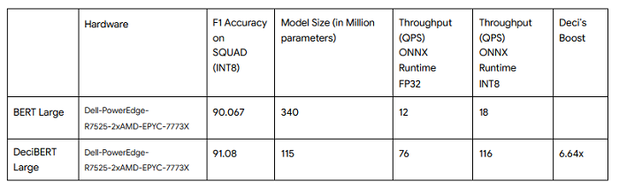 Deci, the deep learning company harnessing Artificial Intelligence (AI) to build better AI, announced results for its Natural Language Processing (NLP) inference model submitted to the MLPerf Inference v2.1 benchmark suite under the open submission track. Generated by Deci’s Automated Neural Architecture Construction (AutoNAC) technology, the NLP model, dubbed DeciBERT-Large, ran on Dell-PowerEdge-R7525-2 hardware using the AMD EPYCTM 7773X processor. The resulting model outperformed both the throughput performance of the BERT-Large model by 6.46x and achieved a 1% boost in accuracy.