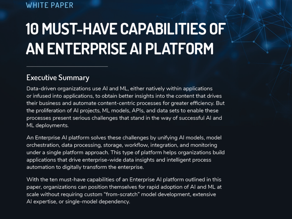 With the ten must-have capabilities of an Enterprise AI platform outlined in this paper from Veritone, organizations can position themselves for rapid adoption of AI and ML at scale without requiring custom “from-scratch” model development, extensive AI expertise, or single-model dependency.
