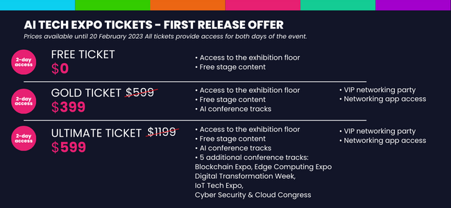 There are three different Expo ticketing options available for attendees; Free Tickets, which give attendees access to the expo floor and free stage content. Gold Tickets are available from $399 and additionally grant access to the AI and Big Data Expo conference tracks, VIP networking party and networking app. Finally Ultimate tickets are available from $599 and also allow attendees entry to the Blockchain, Cyber Security and Cloud, IoT Tech, Edge Computing and Digital Transformation Week expo tracks.