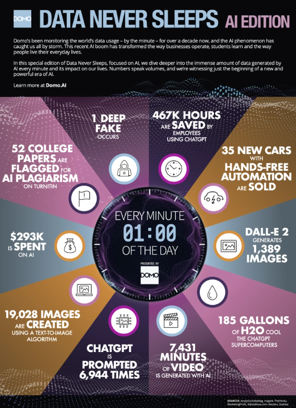 Our friends over at Domo (Nasdaq: DOMO) unveiled a special edition of its popular Data Never Sleeps (DNS) infographic, focused on the proliferation of artificial intelligence (AI). An extension of Domo’s award-winning annual DNS report, this AI Edition provides a deeper dive into the immense amount of AI data generated every minute and the impact this brings into our everyday lives.