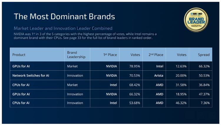 NVIDIA was first place in three of the five brand leadership categories with the highest percentage of votes, while Intel remains dominant with their CPUs. See page 32 in the report for the full list of brand leaders in ranked order.