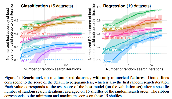 Abstract: While deep learning has enabled tremendous progress on text and image datasets, its superiority on tabular data is not clear. We contribute extensive benchmarks of standard and novel deep learning methods as well as tree-based models such as XGBoost and Random Forests, across a large number of datasets and hyperparameter combinations. We define a standard set of 45 datasets from varied domains with clear characteristics of tabular data and a benchmarking methodology accounting for both fitting models and finding good hyperparameters. Results show that tree-based models remain state-of-the-art on medium-sized data (∼10K samples) even without accounting for their superior speed. To understand this gap, we conduct an empirical investigation into the differing inductive biases of tree-based models and Neural Networks (NNs). This leads to a series of challenges which should guide researchers aiming to build tabular-specific NNs: 1. be robust to uninformative features, 2. preserve the orientation of the data, and 3. be able to easily learn irregular functions. To stimulate research on tabular architectures, we contribute a standard benchmark and raw data for baselines: every point of a 20 000 compute hours hyperparameter search for each learner.